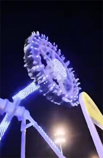 Sementara itu menurut keterangan saksi mata dan video yang beredar di media sosial, wahana yang mengayunkan penumpang dalam lengkungan besar tersebut mengalami kerusakan struktural pada kolom tengahnya, yang patah dan terbelah secara horizontal saat bergerak.